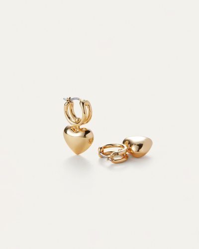 A major engineering feat, these huggies boast an innovative suspension design, allowing a joyful, inflated heart to glide back and forth between a golden rail, creating subtle movement. Finished in high-polish gold.